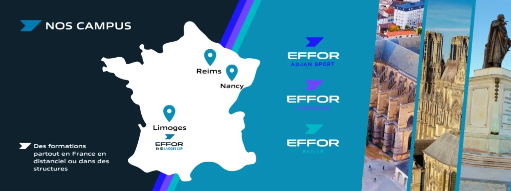Chez EFFOR ACADEMIES, nous préparons les futurs professionnels avec des formations en alternance de qualité, adaptées aux besoins du marché du travail. Nos quatre écoles spécialisées Effor Adjan Sport, Effor Cyberlab, Effor Skills et Effor Limoges CSP – couvrent divers domaines : communication, commerce, événementiel, administration, management, informatique, cybersécurité et métiers du tertiaire. Nos formations, du CAP/BEP au Bac+3, allient théorie et pratique, et sont dispensées par des experts, garantissant ainsi des compétences concrètes et actuelles.