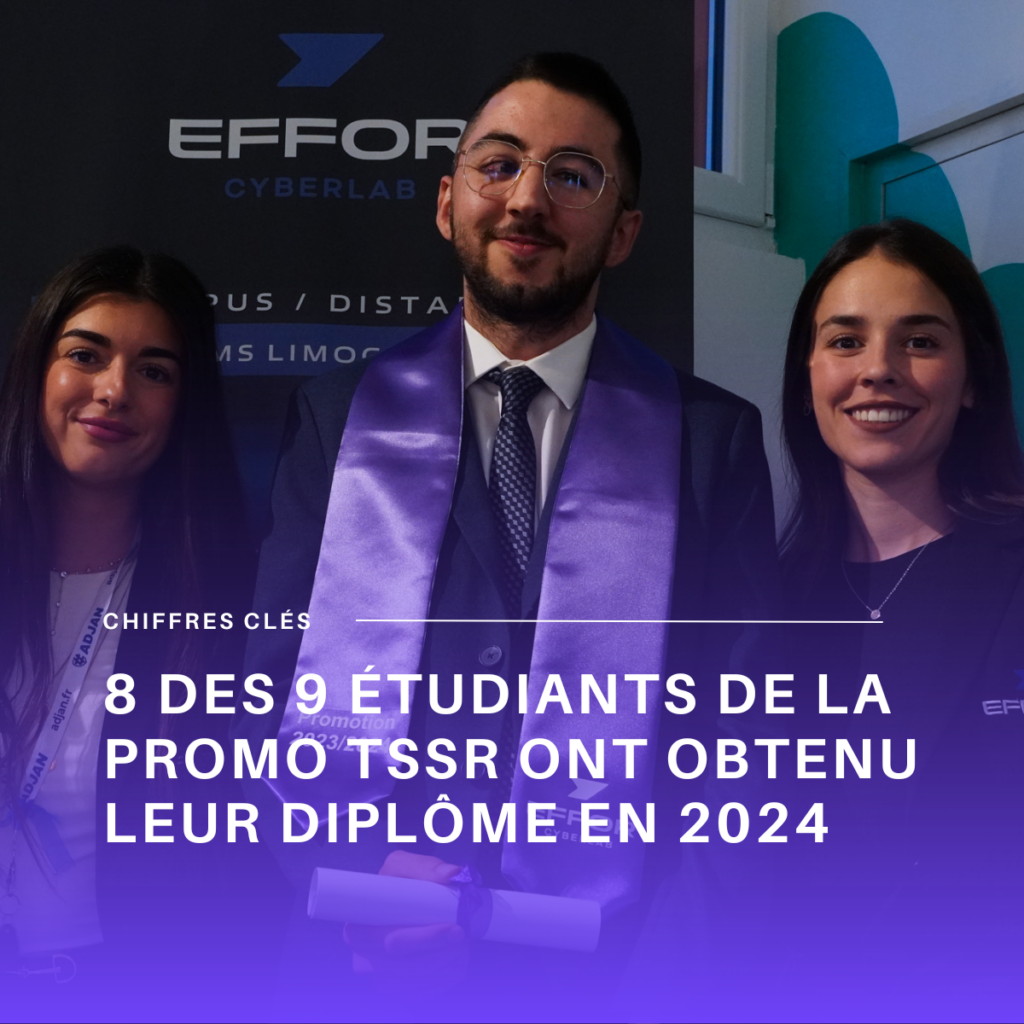 EFFOR Cyberlab met un point d’honneur à accompagner ses apprenants vers la réussite. En 2024, 8 étudiants sur 9 de la promotion TSSR ont obtenu leur diplôme, témoignage de la qualité de l’encadrement et de la pertinence des contenus pédagogiques.